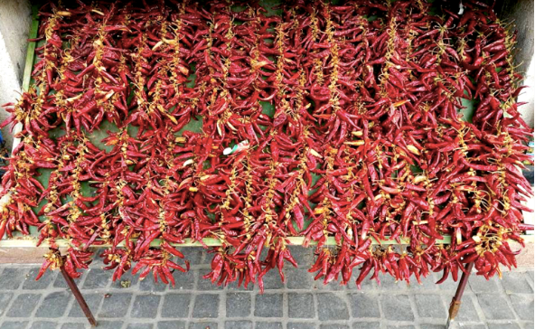 Hungary now contains two paprika museums, which are also working factories – in Kalocsa and Szeged – both towns are centres of paprika production. Here, in the south of Hungary, the weather is sunnier, which allows the plant to become ripe and sweet. When once the dried pods were crushed under foot and ground into powder by pestle and mortar, in the 19th century steam-powered mills made this process much quicker. The Pálfy brothers from Szeged then invented a way to remove the veins and seeds, which made it possible to mass-produce the sweeter variety of paprika which is popular today.